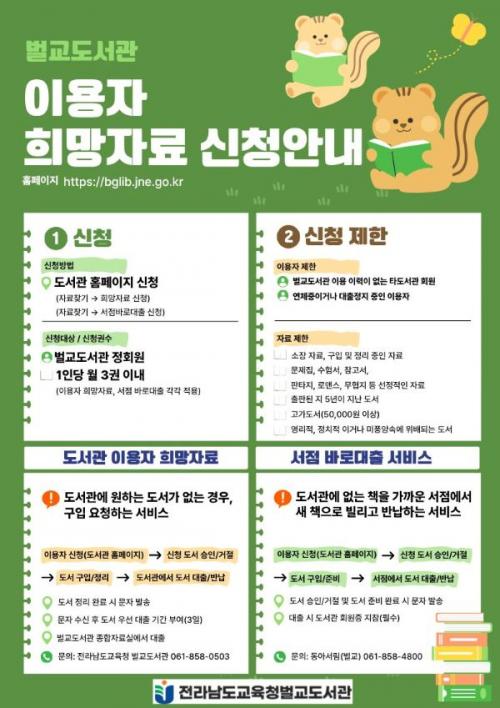 [È£ÅÚ°ü±¤·¹Á®½Å¹® Àü³²¹ú±³=À̽ŵ¿±âÀÚ] Àü¶ó³²µµ±³À°Ã»¹ú±³µµ¼­°üÀº µµ¼­°ü ÀÌ¿ëÀÚÀÇ µ¶¼­ ¸¸Á·µµ¸¦ ³ôÀ̰í ÀÚ·á ÀÌ¿ë ÆíÀǸ¦ °­È­Çϱâ À§ÇØ ¡®ÀÌ¿ëÀÚ Èñ¸ÁÀÚ·á ¼­ºñ½º¡¯¿Í ¡®¼­Á¡ ¹Ù·Î´ëÃâ¼­ºñ½º¡¯¸¦ ¿î¿µÇϰí ÀÖ´Ù. ¡®ÀÌ¿ëÀÚ Èñ¸ÁÀÚ·á ¼­ºñ½º¡¯´Â µµ¼­°ü¿¡ ¼ÒÀ塦