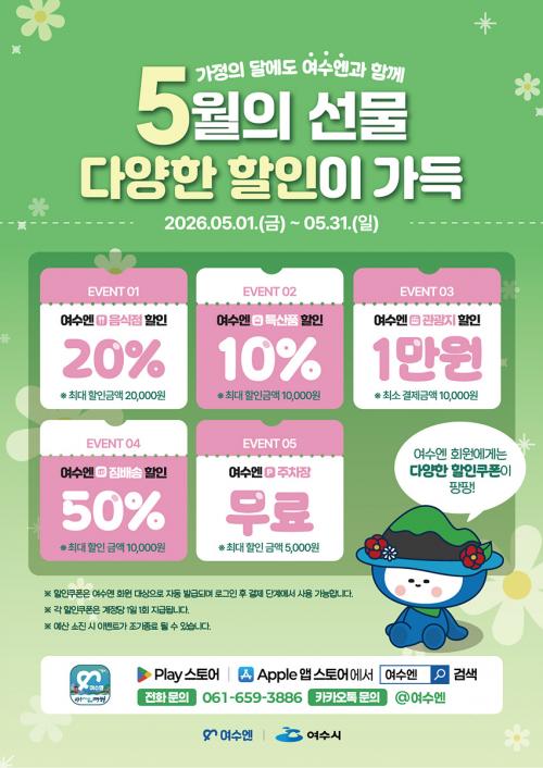[È£ÅÚ°ü±¤·¹Á®½Å¹® ¿©¼ö=±è±â³² ±âÀÚ] ¿©¼ö½Ã(½ÃÀå Á¤±â¸í)´Â 5¿ù °¡Á¤ÀÇ ´ÞÀ» ¸Â¾Æ ½º¸¶Æ®°ü±¤ ÅëÇÕÇ÷§Æû ¡®¿©¼ö¿£¡¯À» ÅëÇØ ÇÒÀÎ ÇÁ·Î¸ð¼Ç°ú °ÅºÏ¼±ÃàÁ¦ ¿¬°è À̺¥Æ®¸¦ ¿î¿µÇÑ´Ù°í ¹àÇû´Ù. ¡®2026 °¡Á¤ÀÇ ´Þ ¸ÂÀÌ ¿©¼ö¿£ ÇÁ·Î¸ð¼Ç¡¯Àº 5¿ù 1ÀϺÎÅÍ 31ÀϱîÁö ÇÑ ´Þ¡¦