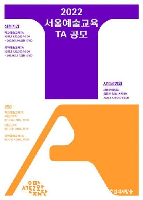 À̹ø 2022³â ¼¿ï¿¹¼ú±³À°»ç¾÷ °ø¸ð´Â 27ÀÏ(¿ù)ºÎÅÍ ¼¼¿ï¿¹¼ú±³À°¼¾ÅÍ ¡®¿¹¼ú³îÀÌ·¦(LAB) TA¡¯ °ø¸ð¸¦ ½ÃÀÛÀ¸·Î 29ÀÏ(¼ö) ¡®Çб³¿¹¼ú±³À°TA¡¯, ¡®Áö¿ª¿¹¼ú±³À°TA¡¯ °ø¸ð µî ÃÑ 9°³ ºÐ¾ß¸¦ Á¢¼ö ¹Þ½À´Ï´Ù.
