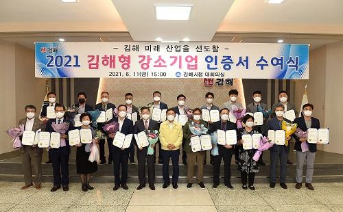 [È£ÅÚ°ü±¤·¹Á®½Å¹®´º½º=ÀÌÇýºó ±âÀÚ] ±èÇØ½Ã´Â Áö³­ 11ÀÏ ½Ãû ´ëȸÀǽǿ¡¼­ 2021³â ±èÇØÇü °­¼Ò±â¾÷ 20°³»ç¿¡ ÀÎÁõ¼­¸¦ ¼ö¿©Çß½À´Ï´Ù. ½Ã´Â 2019³âºÎÅÍ 2022³â±îÁö 4³â°£ Çõ½Å¼º°ú ¼ºÀåÁüÀç·ÂÀ» °®Ãá Áö¿ª»ê¾÷ ¼±µµ±â¾÷ 100°³»ç¸¦ ¹ß±¼Çϱâ·Î ÇÏ°í ¸Å³â 20°³»ç¸¦ ¼±¡¦