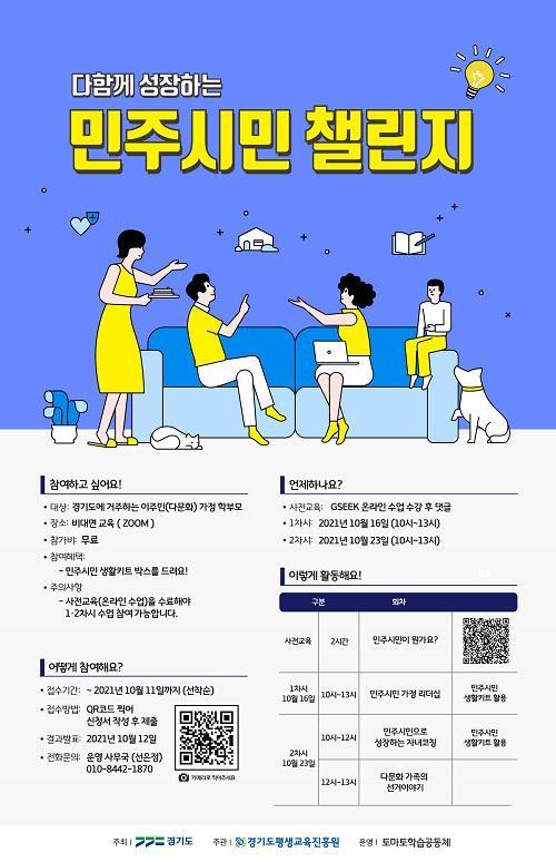 [È£ÅÚ°ü±¤·¹Á®½Å¹®´º½º=¹èÁöÀ± ±âÀÚ] °æ±âµµÆò»ý±³À°ÁøÈï¿øÀÌ ¹ÎÁֽùα³À° ÇÁ·Î±×·¥¿¡ Âü¿©ÇÒ ´Ù¹®È­ °¡Á¤ Çлý°ú Çкθ𸦠10¿ù 13ÀϱîÁö ¸ðÁýÇÕ´Ï´Ù. Áö¿ª°øµ¿Ã¼ ¾È¿¡¼­ ±¸¼º¿øÀ¸·Î¼­ ÇÔ²² »ì¾Æ°¡´Â ¹æ¹ýÀ» ¾Ë·ÁÁÖ´Â À̹ø ±³À°Àº »çÀü±³À° 2½Ã°£, ºñ´ë¸é Âü¿©Çü ¡¦
